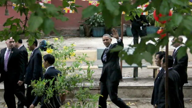 Sau khoảng 15 phút tham quan ngôi chùa cổ, ông Obama ra ngoài vẫy tay chào mọi người. Ảnh: Hoàng Giang (PLO)