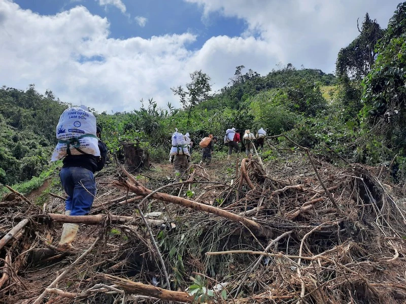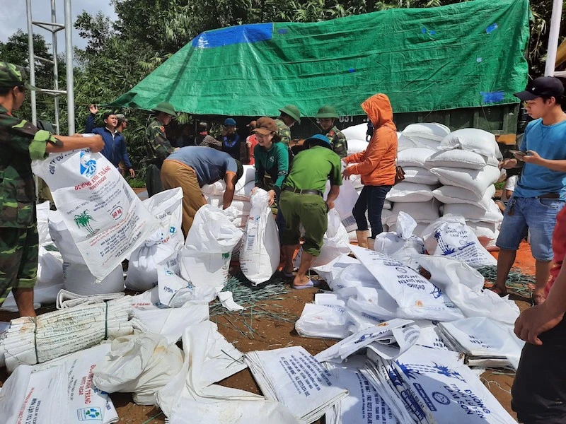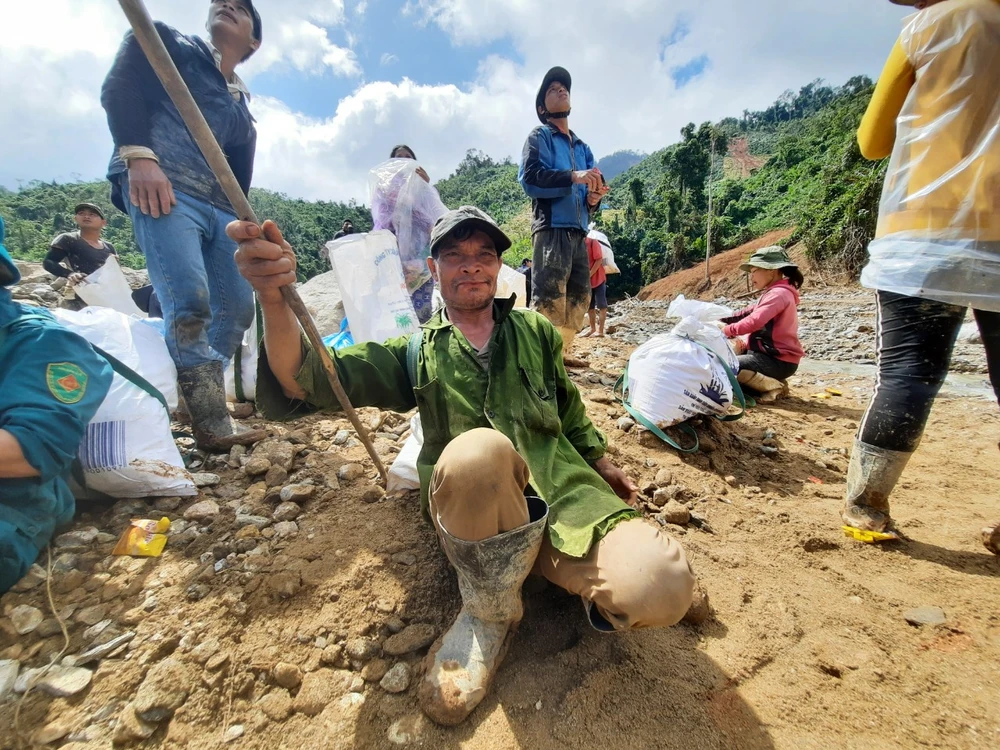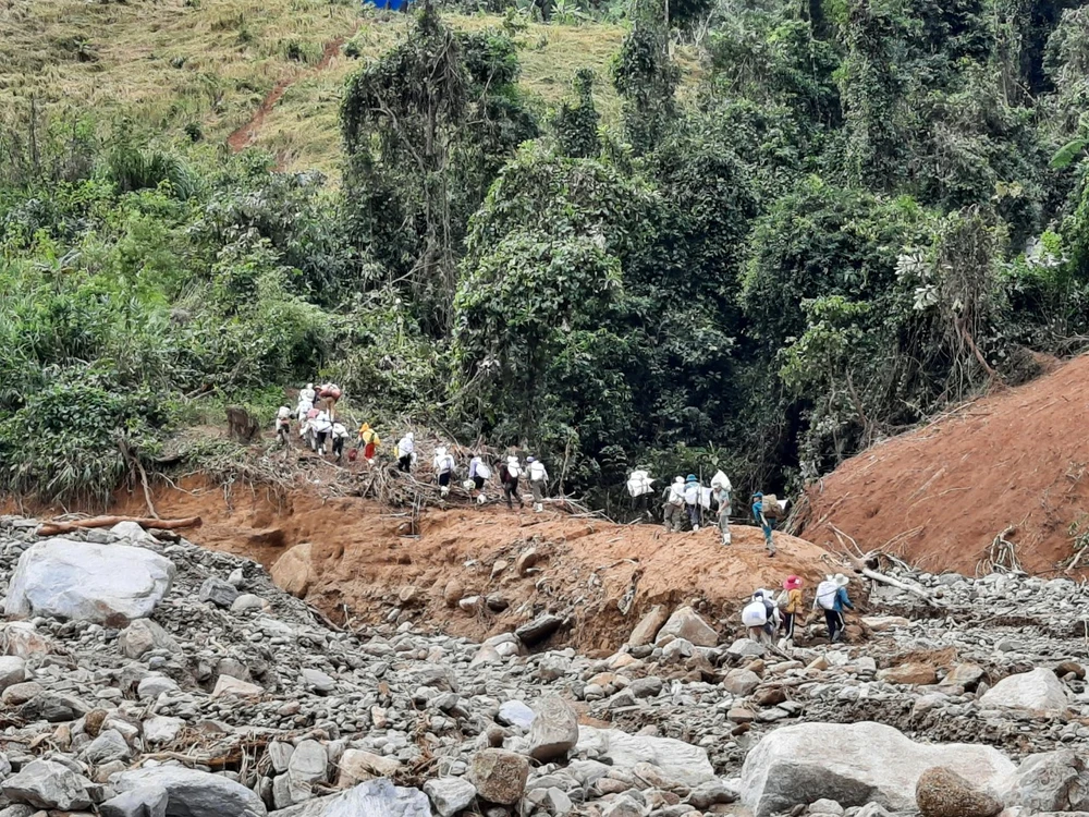 Đường vào xã Phước Lộc sạt lở nghiêm trong, người dân cùng lực lượng tại chỗ được huy động cõng bộ lương thực từ điểm tập kết xã Phước Công vào trong tiếp tế. Ảnh: AK