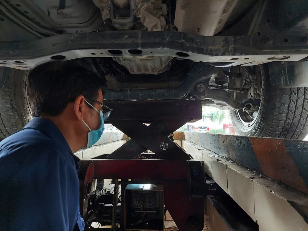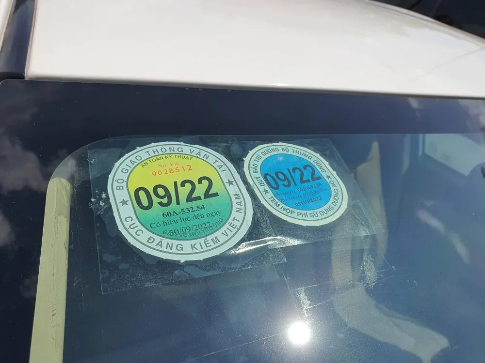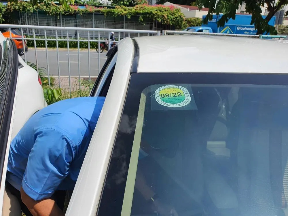 Kiểm định viên đang dán tem cho xe hoàn thành kiểm định.