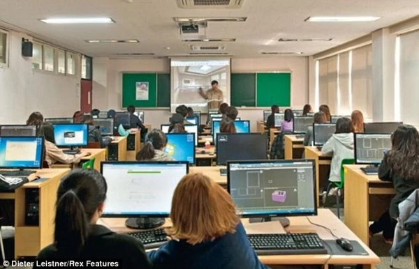 Những sinh viên tại trường Đại học Daelim (Hàn Quốc) dùng máy vi tính và màn hình chiếu để học tập.