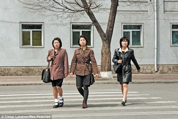 3 cô gái trẻ trong bộ đồ màu nâu xám trên đường phố Triều Tiên.