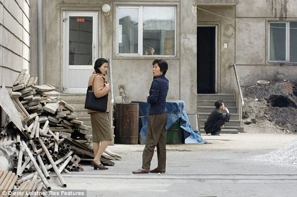 2 phụ nữ nói chuyện với nhau trước căn nhà đang xây dở ở Triều Tiên.