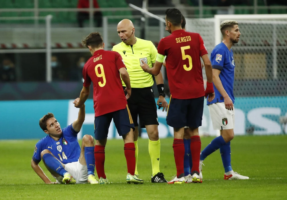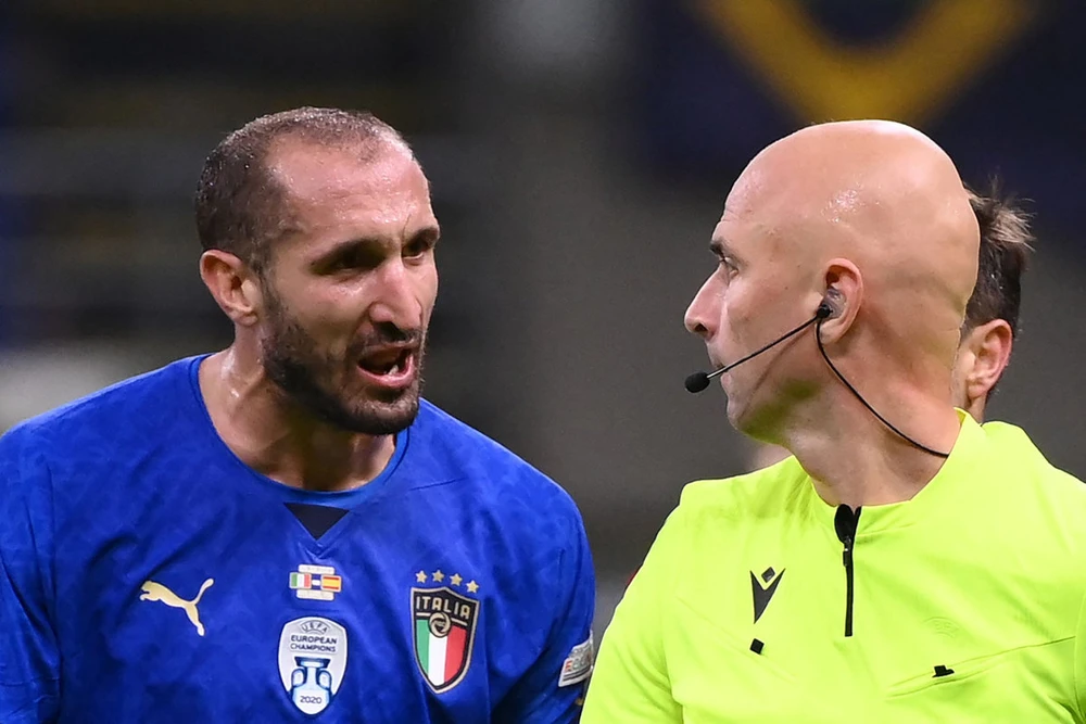 Đội trưởng Chiellini ý kiến với trọng tài.