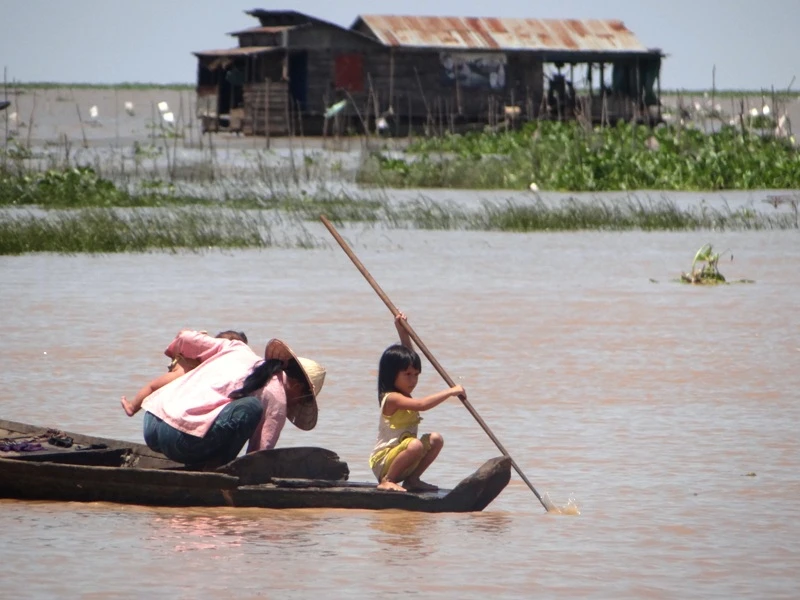 Ngoài biết bơi, trẻ em người Việt ở Biển Hồ cũng phải tập chèo xuồng từ bé để theo bố mẹ mưu sinh. Ảnh: TRUNG THANH