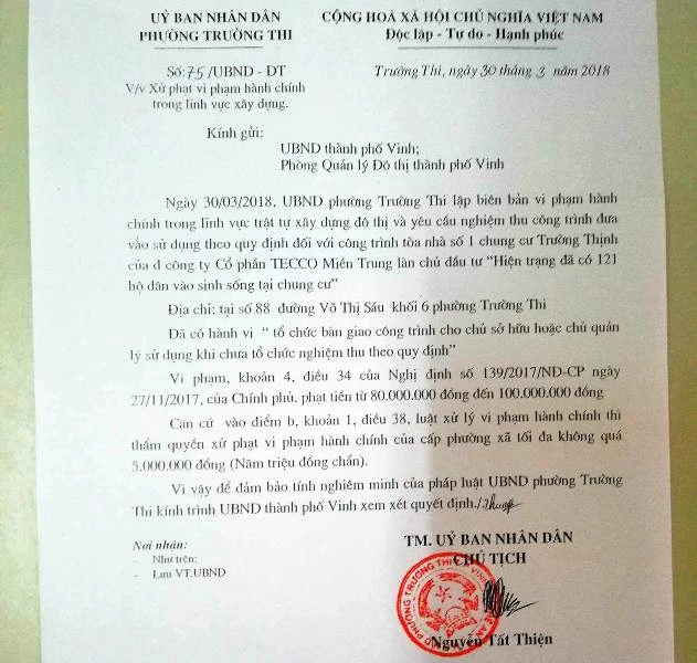 Ông Nguyễn Tất Thiện, Chủ tịch UBND phường Trường Thi đã đề nghị UBND TP Vinh xử phạt Công ty CP Tecco Miền Trung từ 80 đến 100 triệu đồng do đã có “hành vi tổ chức bàn giao công trình cho chủ sở hữu hoặc chủ quản lý sử dụng khi chưa tổ chức nghiệm thu theo quy định”.