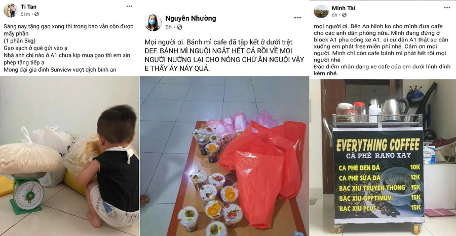 Tài khoản Minh Tài và Nguyễn Nhường cũng gửi nhiều suất cà phê, trà sữa và bánh mì cho người dân ở block A1. Minh Tài còn phát thêm 25 suất cơm miễn phí cho những anh dân phòng, công an đang trực tại chung cư. Anh kể thấy mình phát cà phê miễn phí cho người dân, có người đã ủng hộ anh 100.000 đồng.