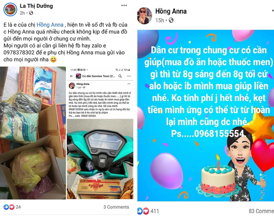 “Dân cư trong chung cư có cần giúp (mua đồ ăn hoặc thuốc men) gì thì từ 8 giờ sáng đến 8 giờ tối cứ alo hoặc inbox, mình mua giúp liền nhé. Không tính phí gì hết nhé, kẹt tiền mình ứng có thể từ từ hoàn lại mình cũng được nhé”.
