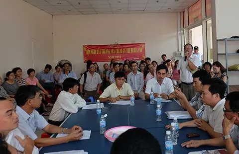 Sáng 24-6, Sở Xây dựng TP.HCM sẽ làm việc với chủ đầu tư và cư dân chung cư The Ruby Land để giải quyết những vướng mắc còn tồn đọng. Trong ảnh: Các cư dân đang bày tỏ bức xúc tại hội nghị bất thường nhà chung cư, tổ chức tháng 3-2015. Ảnh: V.HOA
