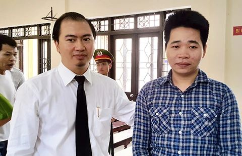 Đàm Thuận Thao (phải) cùng luật sư của mình sau khi được cho tại ngoại tại phiên tòa phúc thẩm ngày 28-7-2015. Ảnh: C.LUẬN