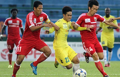 Hà Nội T&T (giữa) mạnh và đều nhưng chơi trên sân Bình Dương lại được tổ chức như ngày hội của riêng Bình Dương sẽ khó có cửa thắng. Ảnh: XUÂN HUY