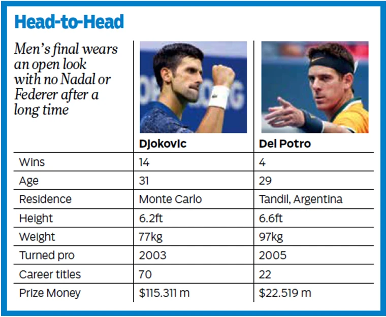 Trước trận chung kết vào sáng sớm 10-9 này thì cả hai tay vợt đều có được phong độ cao. Nếu ở bán kết Djokovic đánh bại Kei Nishikori, Nhật một cách dễ dàng qua tỷ số 3-0 thì Del Potro thắng cuộc trước Nadal vì Nadal tái phát chấn thương gối phải bỏ trận giữa chừng. Cũng cần nói thêm trước khi đưa ra quyết định “tung cờ trắng” vì chấn thương thì Nadal cũng đã hai lần dừng trận để nhờ chăm sóc y tế.