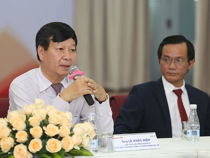 Ông Lê Khắc Hiệp trong buổi lễ công bố giải Fair Play 2019, chia sẻ về sự gắn bó của PVF với giải Fair Play với mong muốn góp phần phát triển bóng đá nước nhà. Ảnh: HOÀNG GIANG