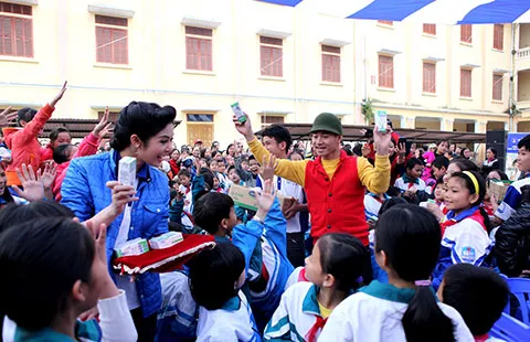 Nghệ sĩ Xuân Bắc và Hoa hậu Ngọc Hân trao tặng sữa trực tiếp cho trẻ em Thái Bình. Ảnh: XUÂN PHÚ - HOÀNG HÀ