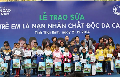 Đoàn công tác cấp cao, đại diện lãnh đạo tỉnh và Vinamilk trao tặng sữa cho trẻ em chất độc da cam tỉnh Thái Bình. Ảnh: XUÂN PHÚ - HOÀNG HÀ