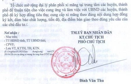 Công văn chỉ đạo sử dụng xi măng của Công ty Cổ phần Xi măng Xuân Thành 2. Ảnh: LÊ PHI