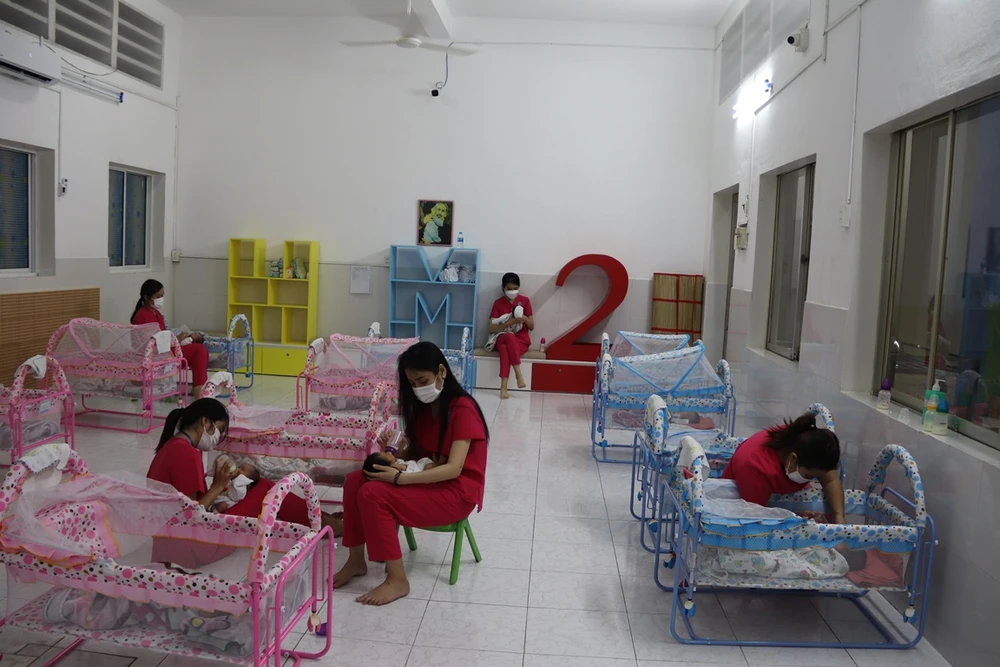 Các bảo mẫu Trung tâm Hope Bệnh viện Hùng Vương đang chăm sóc cho các bé chưa có người thân đón về do đang điều trị bệnh COVID-19. Ảnh: HOÀNG LAN