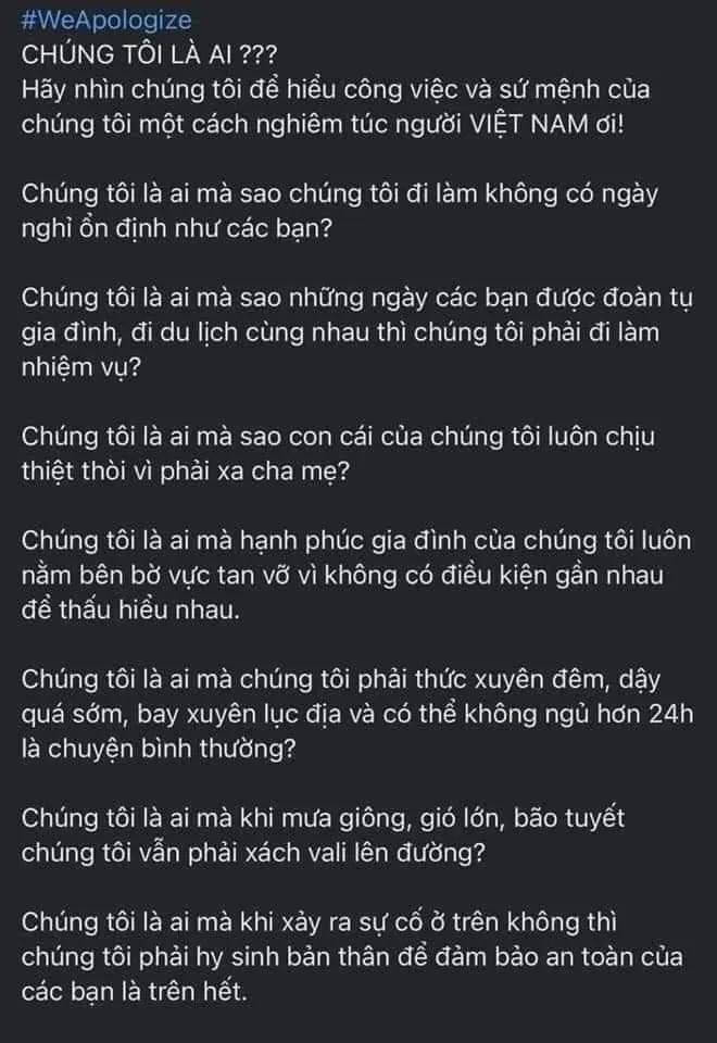 Thế thì hôm nay lại mọc ra cái thông điệp "Chúng tôi là ai...?" kể lể công trạng và sự hy sinh của mình, khi mà cả xã hội đang gồng lên sau mấy tháng bình yên vì sai phạm của BN1342 và sự thiếu trách nhiệm của VNA trong quản lý cách ly.