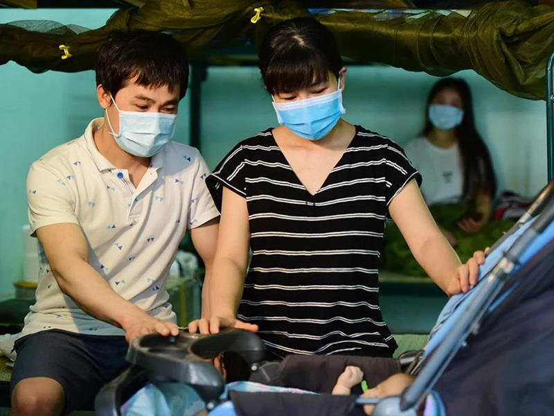 Vợ chồng anh Hoàng Văn Linh cùng con trai gần hai tháng tuổi được bố trí phòng riêng trong khu cách ly. Ảnh: THANH TUYỀN