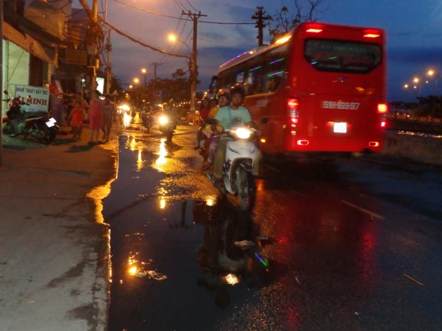 Ngay trước cuộc tiếp xúc cử tri vài phút, nước triều lên thấm qua bờ bao và tràn ra đầy mặt đường bến Bình Đông.