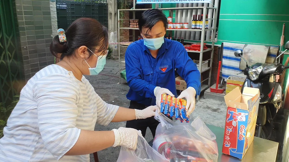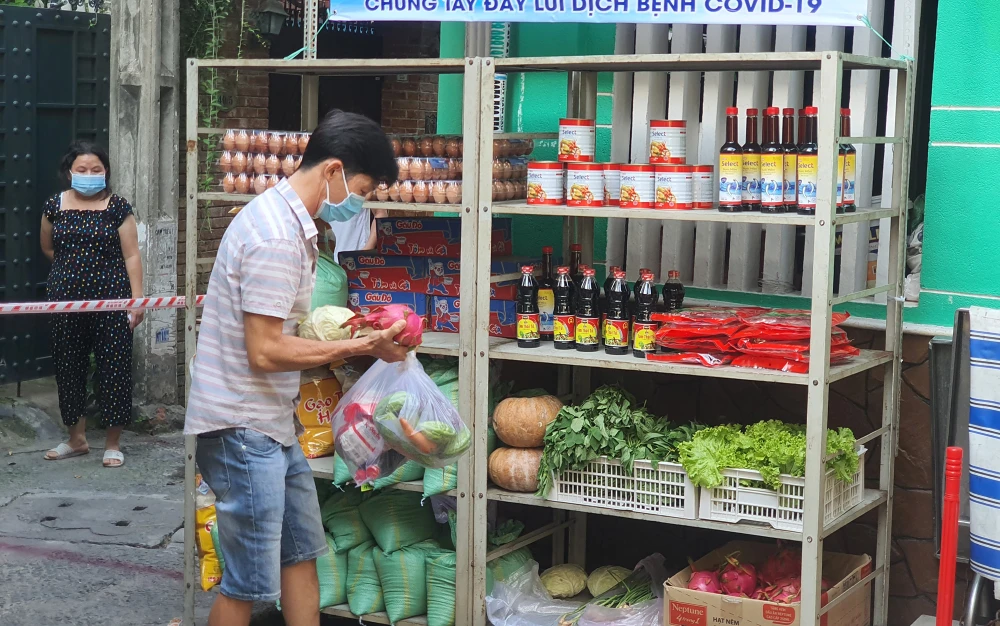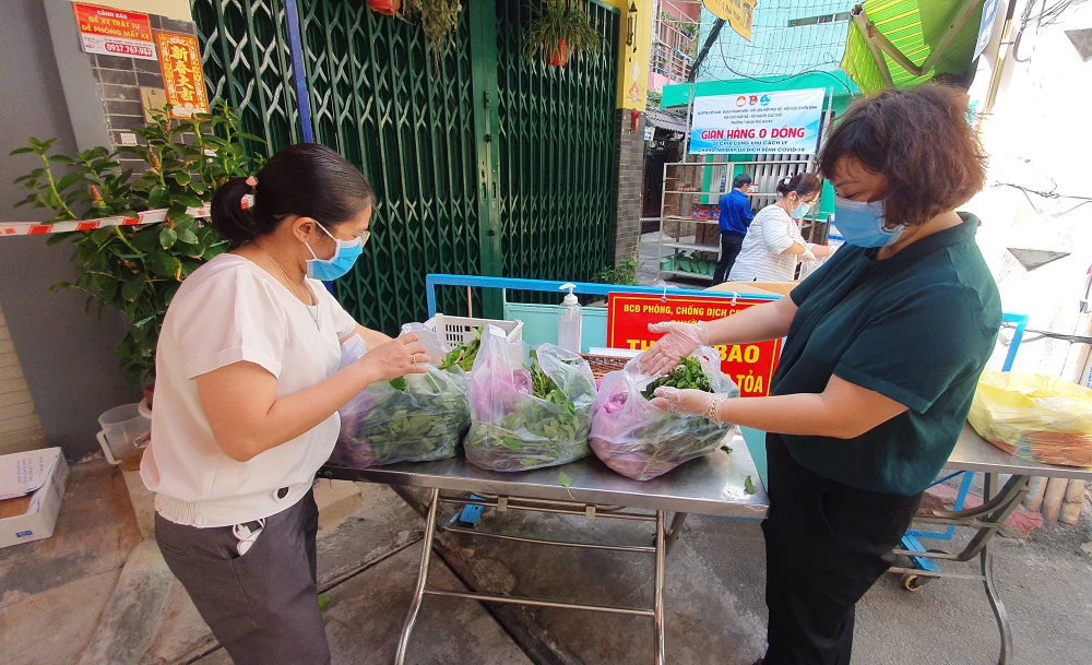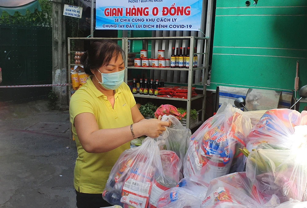 Sáng 19-6, gian hàng 0 đồng dành cho các hộ dân cách ly tại hẻm 40 Phan Tây Hồ, phường 7, quận Phú Nhuận tổ chức cung cấp thực phẩm cho các hộ dân. Gian hàng do UBMTTQ quận phát động, phối hợp cùng UBND phường 7 tổ chức thực hiện với khẩu hiệu “chia sẻ cùng khu cách ly, chung tay đẩy lùi dịch bệnh COVID-19”.