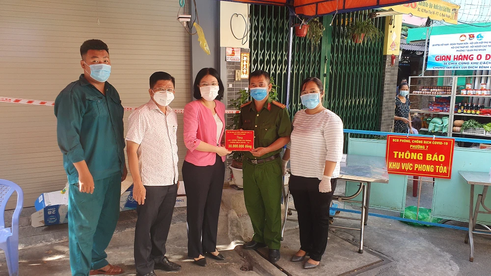 Sáng cùng ngày, bà Đặng Thị Lý, Phó Chủ tịch Uỷ ban Mặt trận Tổ quốc Việt Nam quận Phú Nhuận đã đến thăm và trao quà cho lực lượng tham gia phòng chống dịch tại khu vực hẻm 40 Phan Tây Hồ.