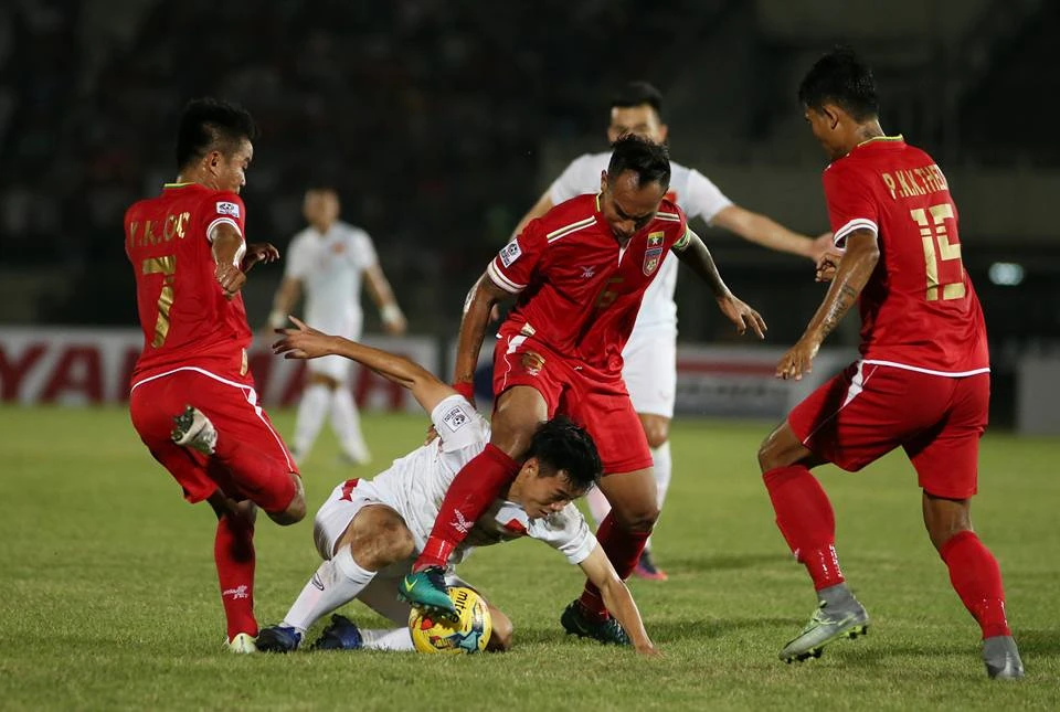 Myanmar (đỏ) chơi rất... máu lửa trên sân nhà. Ảnh: BD