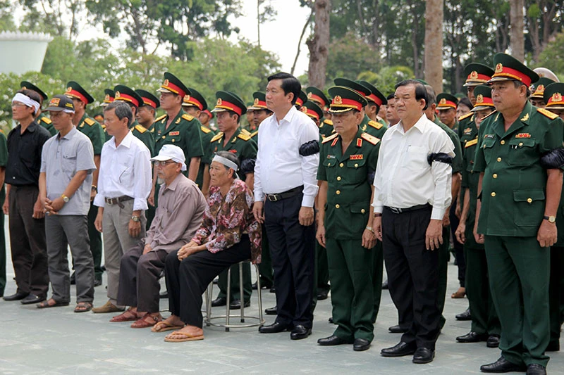 Bí thư Thành ủy TP.HCM Đinh La Thăng (thứ tư từ phải sang) cùng các cán bộ, chiến sĩ, thân nhân gia đình liệt sĩ tham dự lễ viếng, truy điệu và an táng hài cốt 14 liệt sĩ tại nghĩa trang huyện Củ Chi. Ảnh: HOÀNG GIANG
