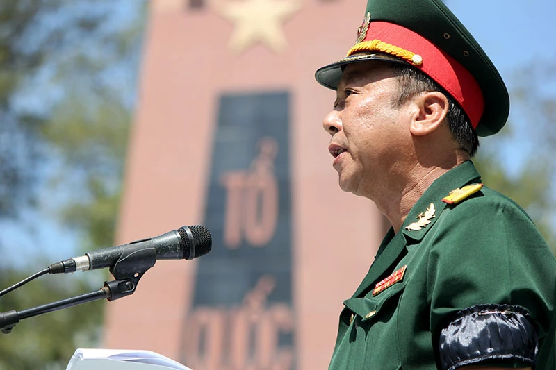 Đại tá Phạm Tiến Dũng - Ủy viên Ban Thường vụ Đảng ủy, Phó Chính ủy Quân đoàn 4 đọc điếu văn truy điệu các liệt sĩ. Ảnh: HOÀNG GIANG