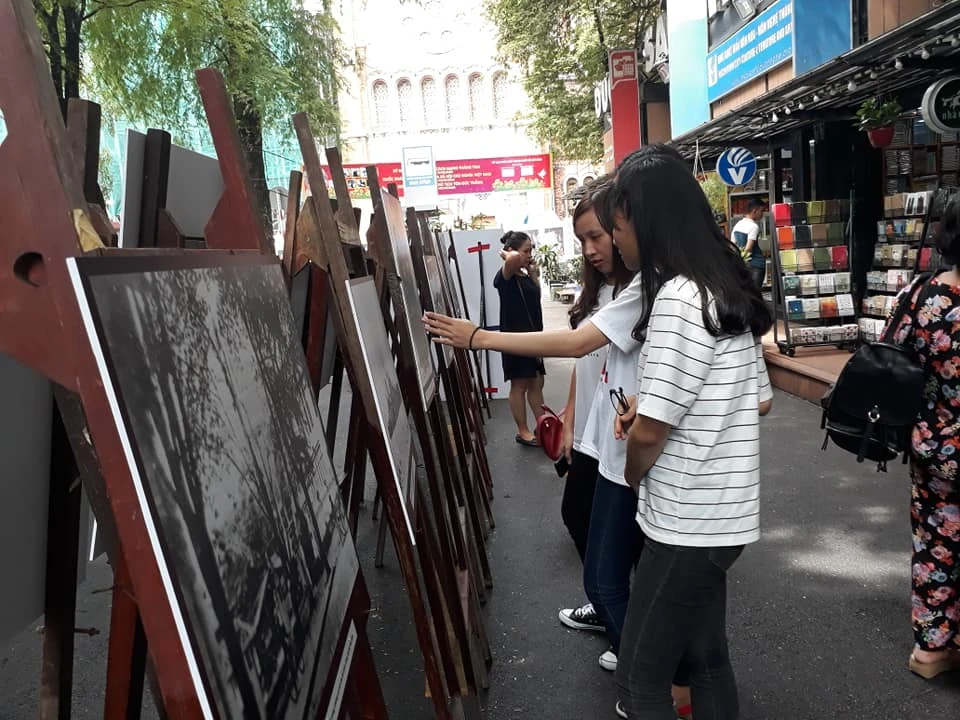 Bạn trẻ xem triển lãm ảnh về Bác Tôn tại Đường Sách.