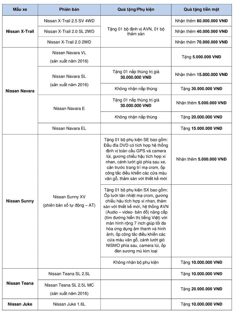 Trong đó, mức khuyến mãi tối đa lên đến 100 triệu đồng (tùy mẫu xe) và áp dụng cho hầu hết các dòng xe Nissan (X-Trail, Navara, Sunny, Teana, Juke). Cụ thể: