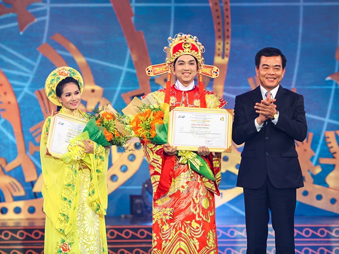 Hai thí sinh đoạt giải chuông vàng (giữa) và chuông bạc cuộc thi "Chuông vàng vọng cổ 2014" trong phút đăng quang