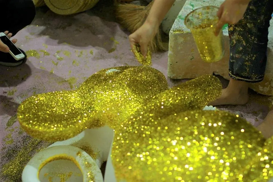 Những chú chuột được tạo hình từ các khối xốp, sau đó được tô vàng và rải kim tuyến và đem phơi khô. Tất cả công đoạn đều được làm bằng thủ công.