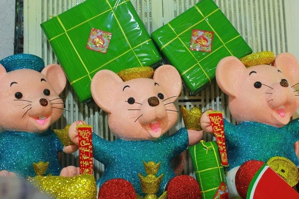 Chuột được phủ màu vàng và kim tuyến lấp lánh nhiều hơn cả. Theo những người thợ nơi đây, linh vật này biểu tượng cho sự may mắn, tiền tài.
