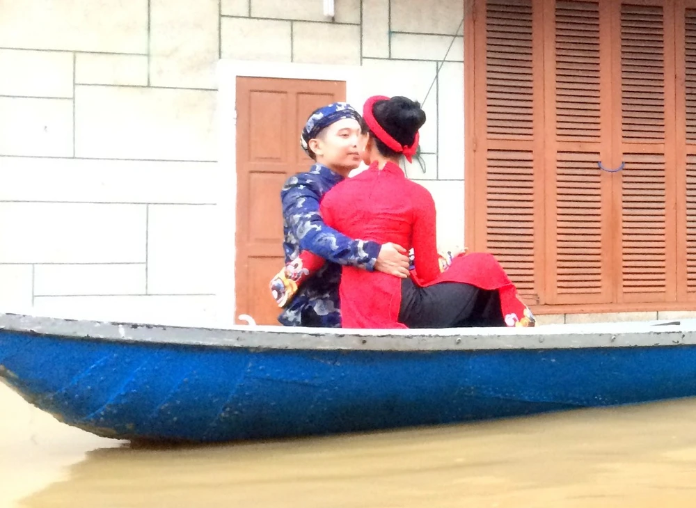 Các đôi uyên ương chụp ảnh cưới trong nước lũ Hội An. Ảnh: Huy Trường