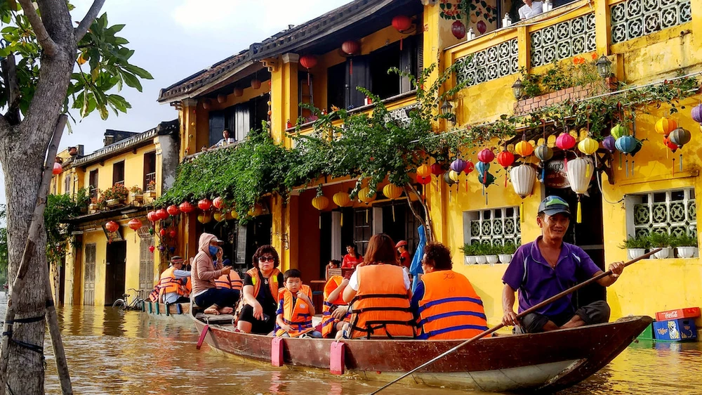 Người dân chèo thuyền chở khách đi tham quan Hội An trong lũ để kiếm thêm tiền sinh hoạt hằng ngày. Ảnh: Huy Trường