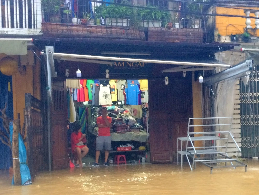 “Từ chiều hôm qua, nước sông Hoài đã dâng cao, đến tối thì nước tràn vào các quầy lưu niệm, ngang tới ngực người. Tôi cùng một số người phải lo thu dọn đồ đạc lên cao. Mưa lũ trong đêm kiểu này giờ mới gặp” - chị Trần Thu Dung, một chủ cửa hàng trên đường Bạch Đằng, cho hay.