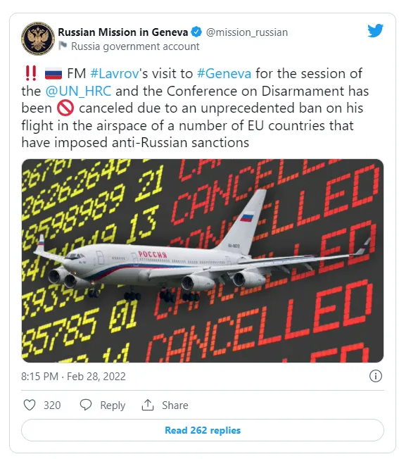 "Chuyến thăm của Ngoại trưởng Lavrov tới Geneva tham dự phiên họp của HRC và Hội nghị giải trừ quân bị đã bị hủy bỏ do lệnh đóng cửa không phận 'chưa từng có' của một số quốc gia EU như một biện pháp trừng phạt chống lại Nga” - phái bộ Nga ở Geneva thông báo trên Twitter.