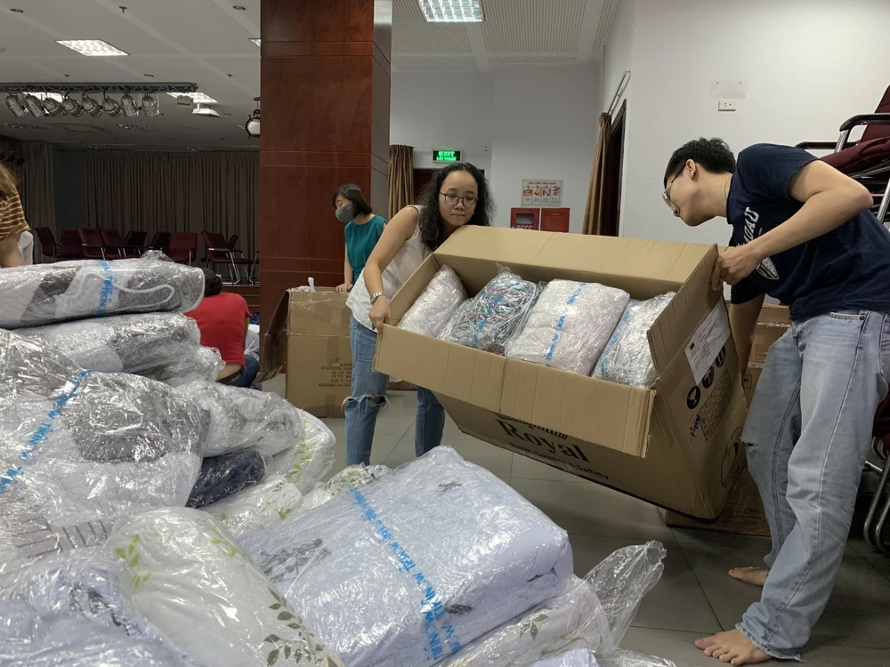 Các thành viên của báo Pháp Luật TP.HCM đóng gói hàng là nhu yếu phẩm mới hoàn toàn để chuyển về miền Trung. Ảnh: QUỲNH TRANG