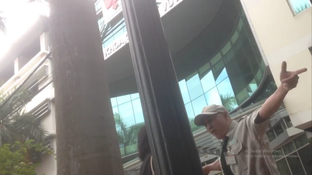 Bảo vệ BV quốc tế Vũ Ảnh yêu cầu PV ra khỏi khuôn viên BV. Ảnh cắt từ clip