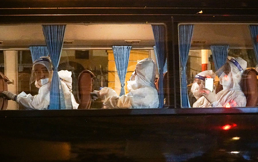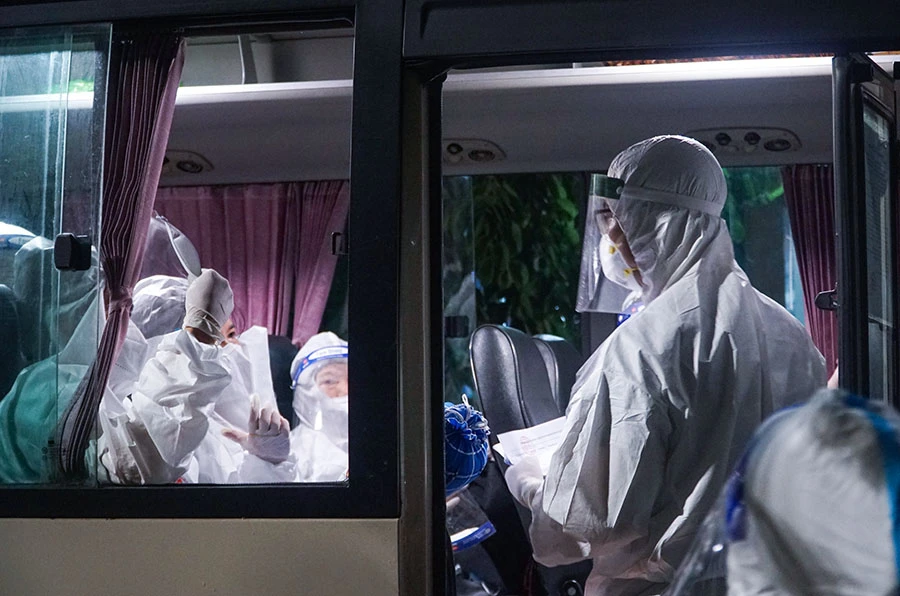 Các nhân viên y tế hỗ trợ người dân vận chuyển đồ đạc mang theo và kiểm tra danh sách.