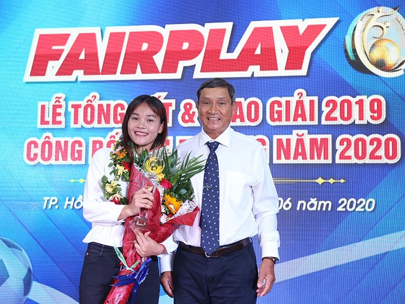 Thầy Mai Đức Chung và trò Chương Thị Kiều tại lễ trao giải Fair Play 2019. ẢNH: HOÀNG GIANG
