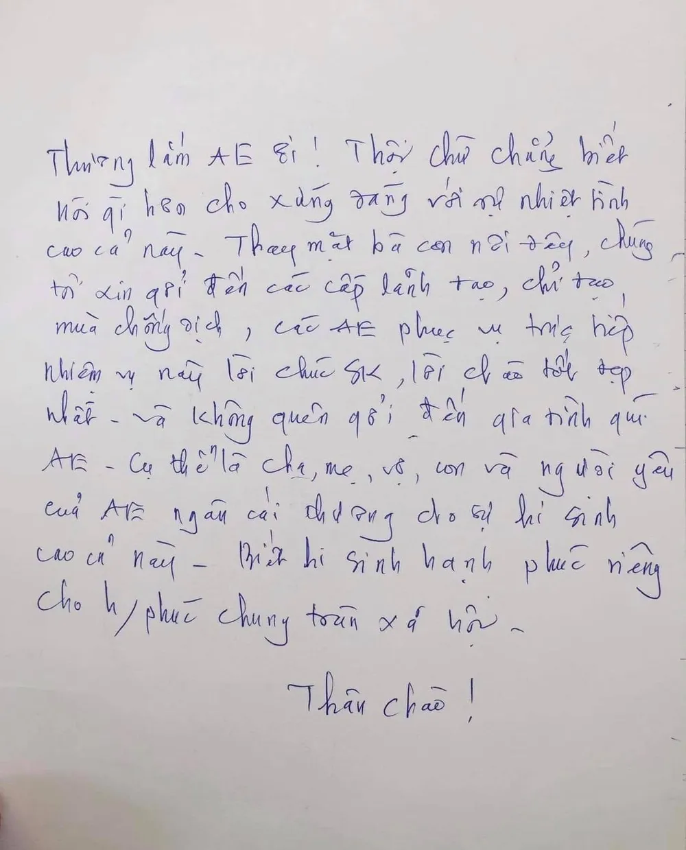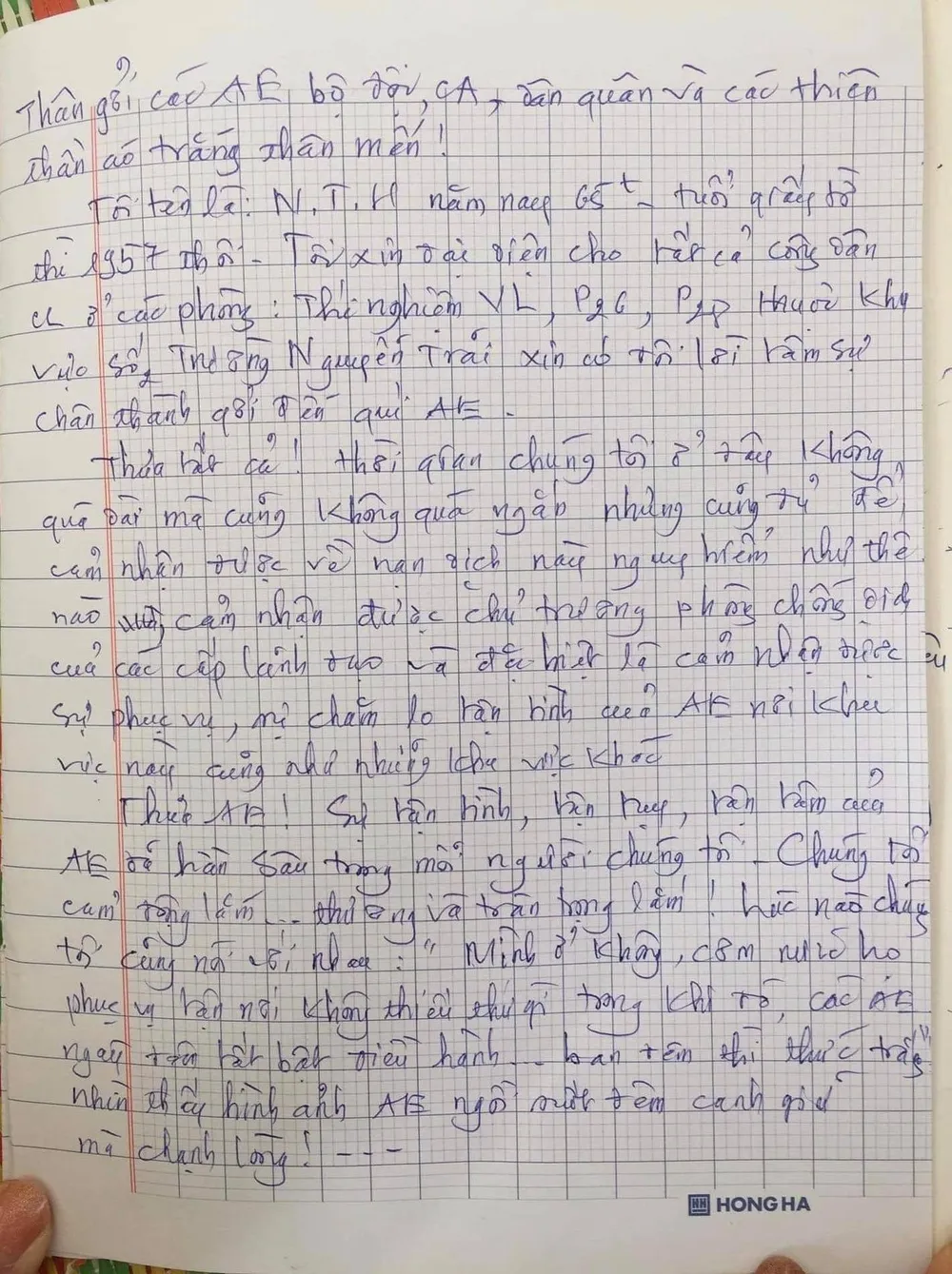 Ngoài những tình cảm dành cho các chiến sĩ, cán bộ y tế làm nhiệm vụ trong thời gian ở khu cách ly số 4, các công dân thực hiện cách ly còn để lại hai bức thư tay được viết cẩn thận. Ở đó, các công dân bày tỏ sự thấu hiểu, sẻ chia với các chiến sĩ, cán bộ làm nhiệm vụ.