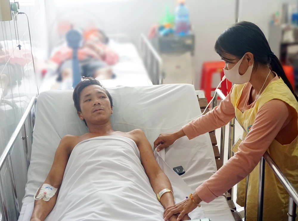 Nằm trên giường bệnh, anh Tâm rất tươi tỉnh, nói chuyện rõ ràng, hoạt bát. Anh Tâm kể lại vào sáng sớm ngày 19-8, anh chở hai con trai ra đồng để đi thăm bẫy rắn và trong lúc vây bắt thì xảy ra tai nạn.