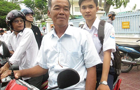 Không giống nhiều phụ huynh, ông Võ Văn Út (68 tuổi, ngụ xã Tân Thạnh, huyện Thới Lai, Cần Thơ) chở cháu ngoại đi thi (ảnh). Tuy xa điểm thi đến 40 km nhưng mỗi ngày ông đều dậy sớm đưa cháu đi từ 5 giờ sáng. “Tui mần có ba công ruộng và nuôi thêm vài con heo. Lộ phí đi thi không tốn mấy nhưng vợ chồng tui cũng phải chuẩn bị từ vài tháng trước” - ông Út kể.