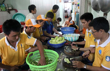 Chưa đến 6 giờ sáng, tại bếp ăn từ thiện Chơn Tâm lửa đã nổi lên để chuẩn bị 2.000 phần cơm miễn phí cho thí sinh và phụ huynh đi thi. Bên trong bếp, các cô, các chú đang nấu các món ăn. Còn phía ngoài, nhiều bạn trẻ đang cắt dưa leo, thái củ cải… Các bạn là tình nguyện viên thuộc Đội phản ứng nhanh Trường ĐH Sài Gòn đến đây để phụ các cô, chú nấu ăn (ảnh). Chú Trần Văn Hưu, trưởng bếp ăn từ thiện Chơn Tâm, cho biết: “Gạo và thức ăn đều do bà con xa gần đóng góp. Các cô chú đến đây nấu nướng không có thù lao, thậm chí còn đóng góp cho bữa ăn thêm dinh dưỡng”.
