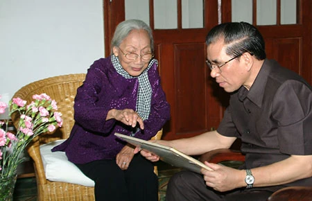Mẹ VNAH Bùi Thị Mè trong một lần tiếp nguyên Tổng Bí thư Nông Đức Mạnh đến thăm. (Ảnh do gia đình cung cấp)