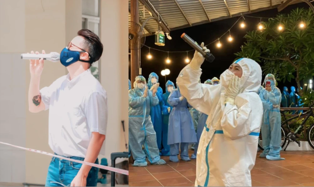 Ca sĩ Hoàng Bách, Phương Thanh hát tại điểm nóng động viên tinh thần các y bác sĩ, bệnh nhân. Ảnh: FBNV