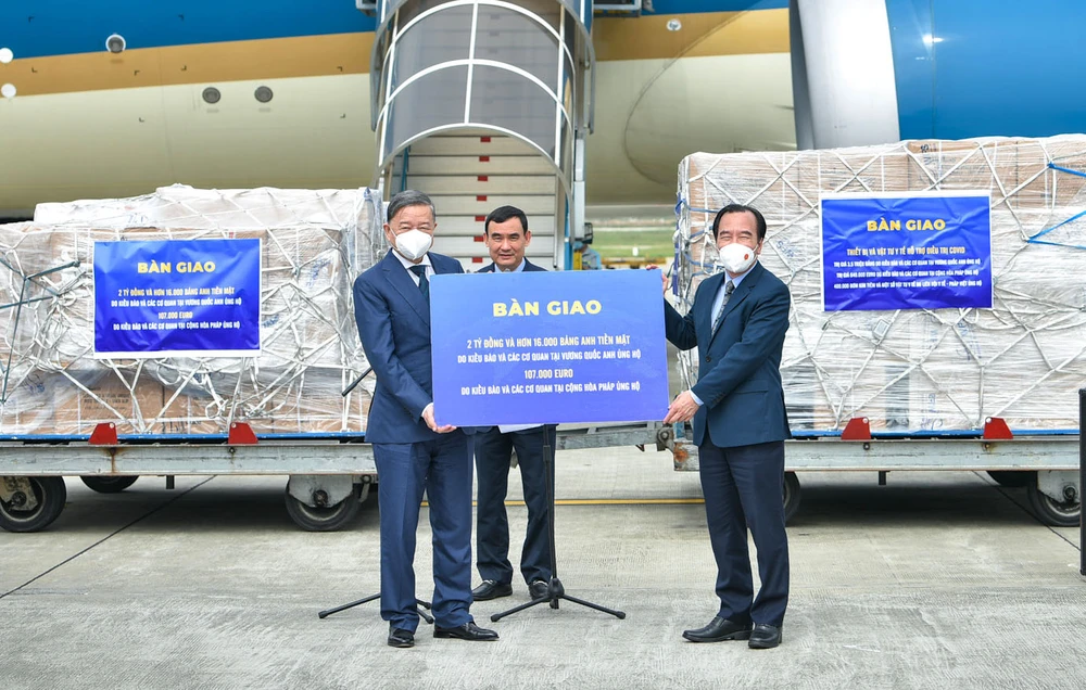 Đại diện đoàn công tác, Ủy viên Bộ Chính trị, Bộ trưởng Bộ Công an Tô Lâm đã trao tượng trưng cho Bộ trưởng Bộ Y tế Nguyễn Thanh Long các vật tư, trang thiết bị y tế mà kiều bào ta ủng hộ. Đồng thời, trao tượng trưng cho Phó Chủ tịch Ủy ban Trung ương Mặt trận Tổ quốc Việt Nam Ngô Sách Thực số tiền kiều bào, các cơ quan ủng hộ công tác phòng chống đại dịch COVID-19.