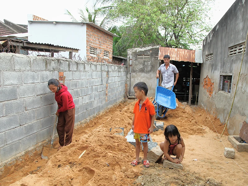 Sáng hôm qua tốt ngày, 21-7, vợ chồng chị Lam cùng thợ khởi công đào móng để xây kiềng nhà. Căn nhà được xây từ tiền tài trợ của công chứng viên Nguyễn Quang Vinh, Trưởng Văn phòng công chứng Bến Nghé.