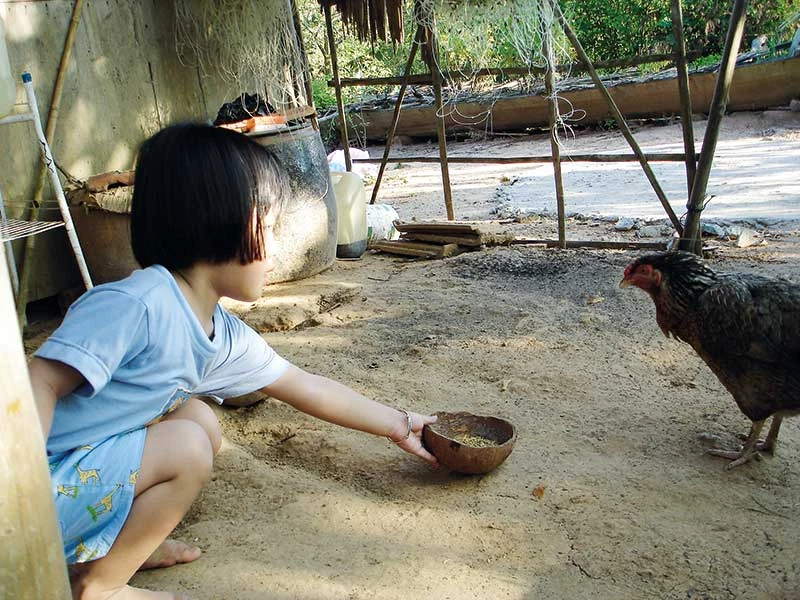 Hai con gà được cả nhà chăm chút đặc biệt, nhất là hai chị em tôi. Hằng ngày chúng tôi thích nhất là đứng canh chuồng gà, “rình” nhặt trứng. Ngay khi gà vừa đẻ, tôi lập tức thò tay vào nhặt lấy cái trứng còn nóng hổi chạy bay bay đi tìm bố. Cái Thanh em tôi lon ton chạy theo, miệng la toáng “Gà đẻ bố ơi, gà đẻ!”.